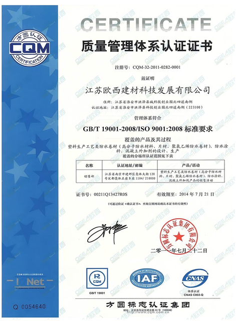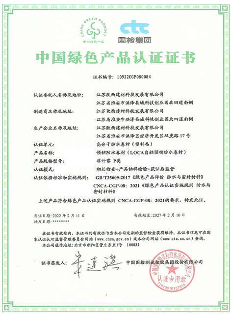 The polymer waterproofing membrane has obtained a root puncture resistance test report, and the product has passed the Jiangsu Quality Certification